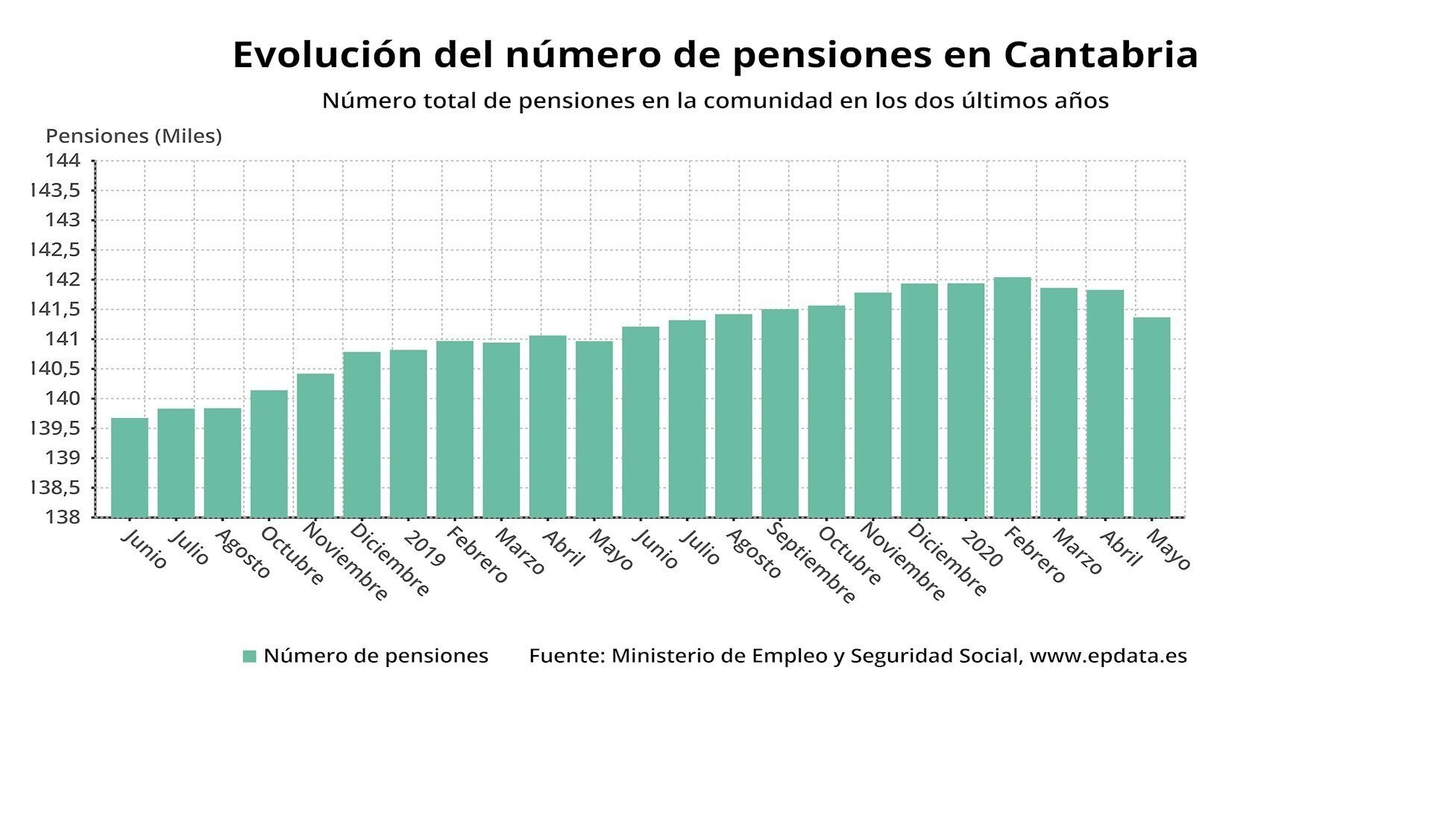 Por su parte, la pensión media del sistema, que comprende las distintas clases de pensión (jubilación, incapacidad permanente, viudedad, orfandad y a favor de familiares), se situó en Cantabria en el quinto mes del año en 1.065,89 euros, un aumento interanual del 2,18%.