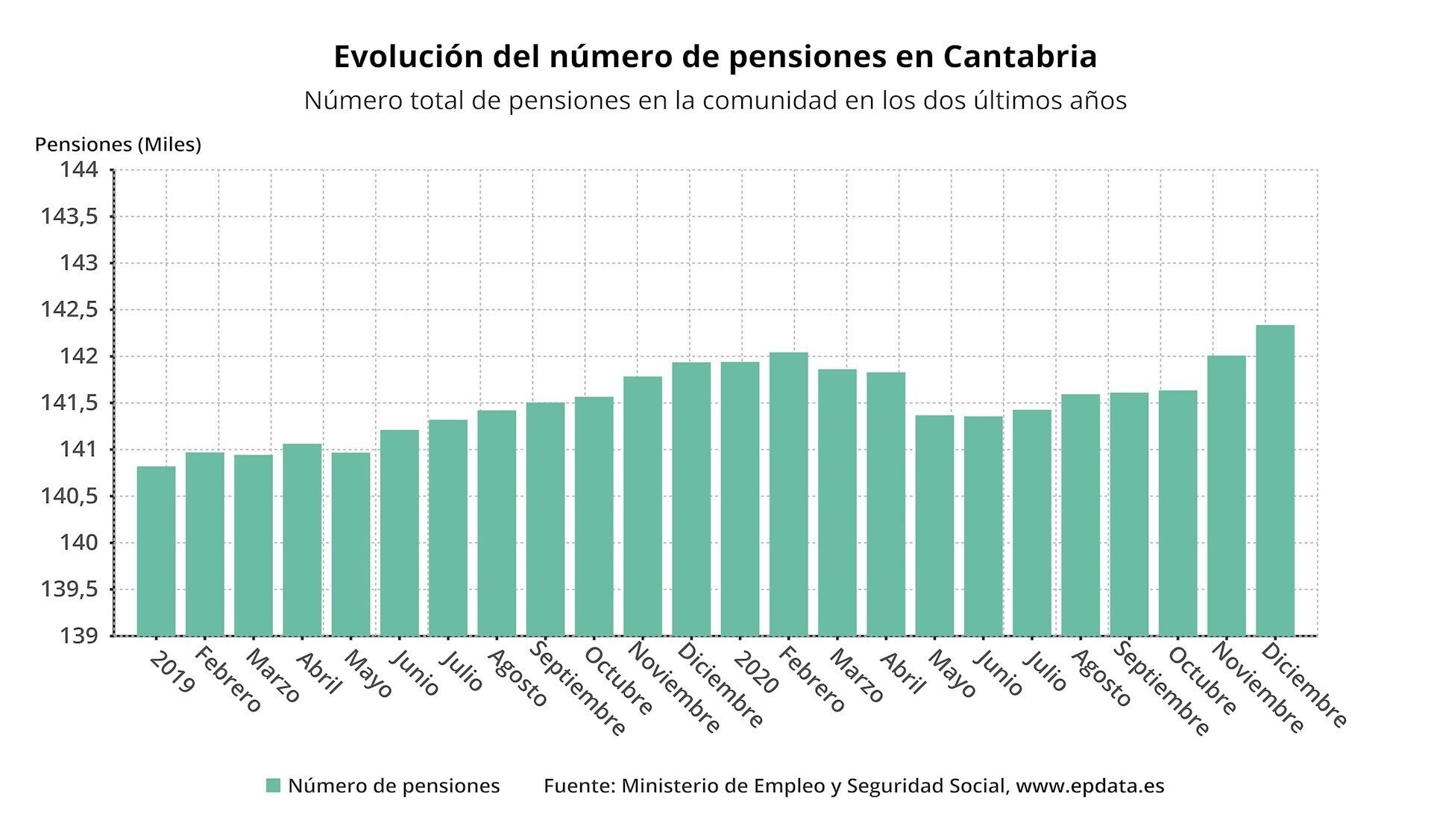 Por su parte, la pensión media del sistema, que comprende las distintas clases de pensión (jubilación, incapacidad permanente, viudedad, orfandad y a favor de familiares), se situó en Cantabria en el último mes del año en 1.075 euros, un aumento interanual del 2,4%.