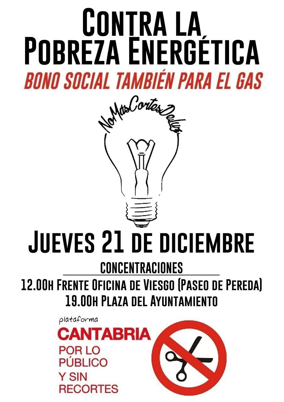 Cantabria por lo Público y Sin Recortes ha convocado mañana, día 21, una concentración contra la pobreza energética que tendrá lugar a las 12.00 horas frente a la oficina de Viesgo en el Paseo Pereda de Santander.