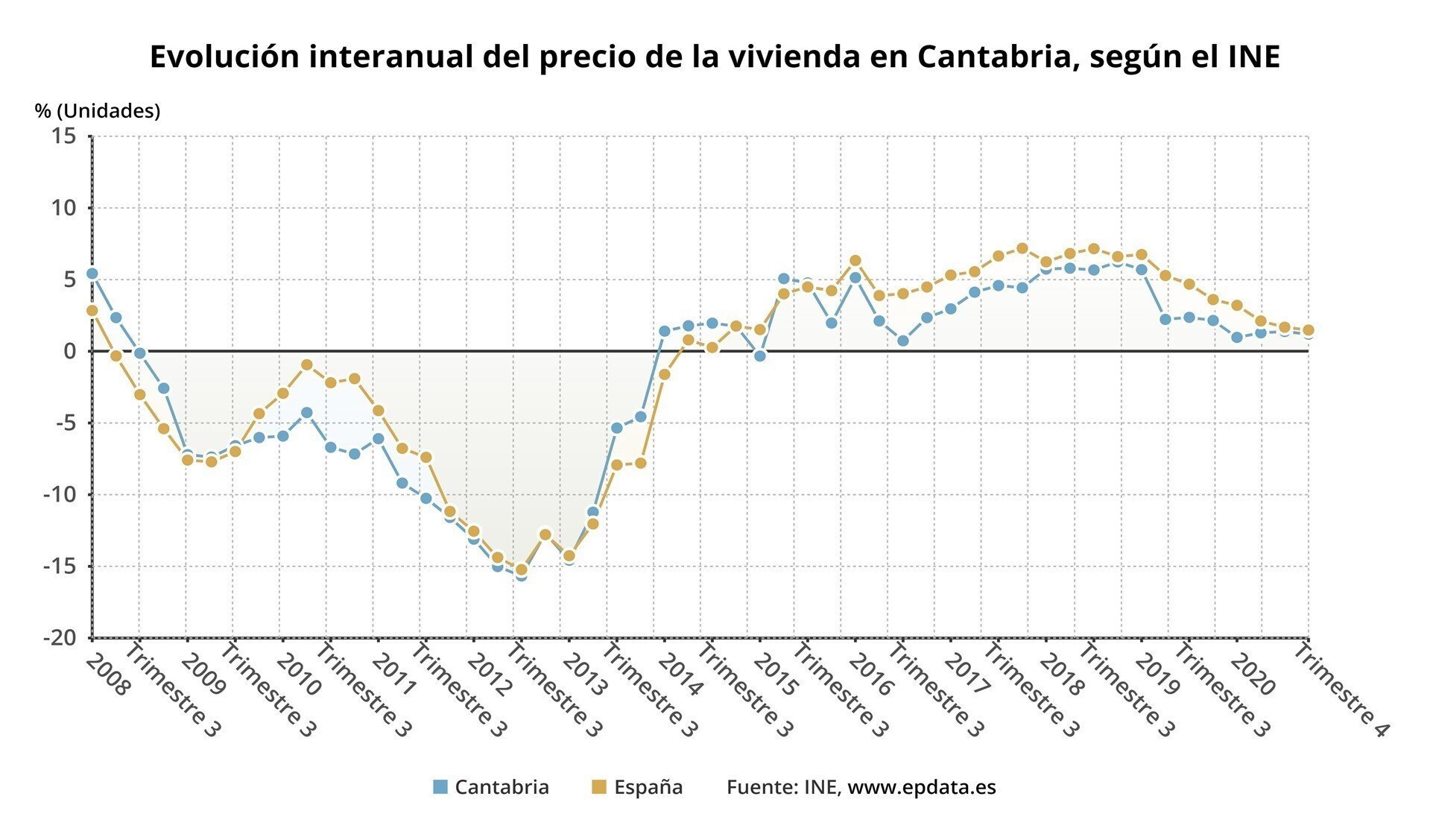 El precio de la vivienda subió en Cantabria un 1,2% en el cuarto trimestre 2020 en relación al mismo periodo del año anterior, medio punto menos de la media nacional que se incrementó un 1,5%, según el Índice de Precios de Vivienda (IPV) del Instituto Nacional de Estadística (INE) publicado este martes.