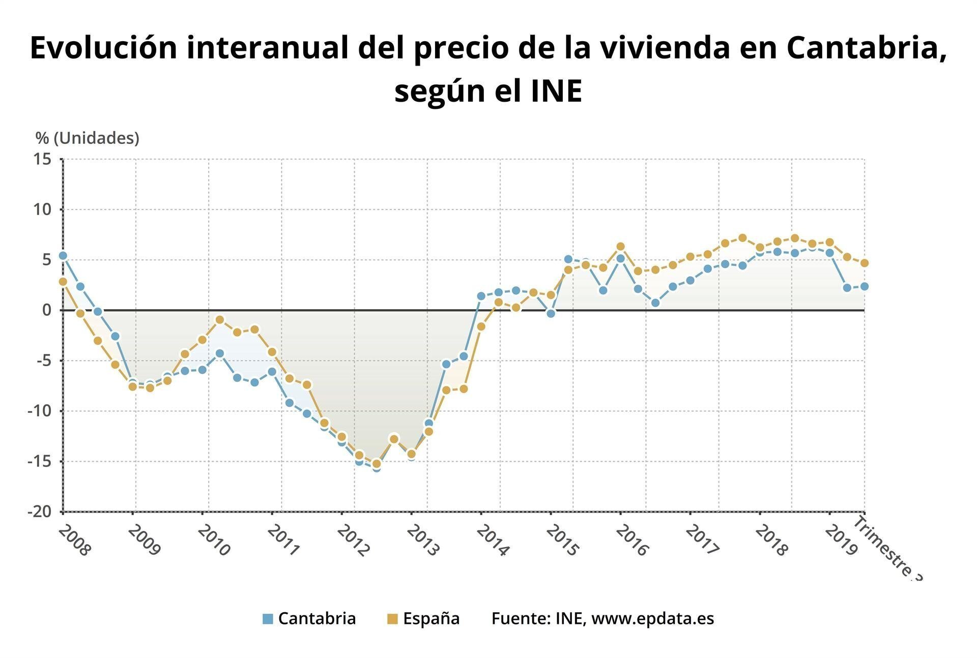 El precio de la vivienda subió en Cantabria un 2,4% en el tercer trimestre en relación al mismo periodo del año anterior, casi la mitad que la media nacional (4,7%), y el incremento más moderado de todas las comunidades salvo Extremadura (1,5%), según el Índice de Precios de Vivienda (IPV) del Instituto Nacional de Estadística (INE) publicado este jueves.