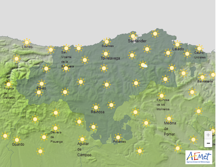 Temperaturas mínimas y máximas previstas: Cabezón de la Sal, 8 y 18 grados; Castro Urdiales, 12 y 17; Potes, 5 y 20; Reinosa, 3 y 16; San Vicente de la Barquera, 9 y 17; Santander, 10 y 18, y Torrelavega, 8 y 19 grados.