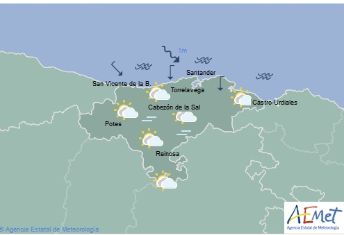 Temperaturas máximas y mínimas previstas: Cabezón de la Sal, 25 y 19 grados; San Vicente de la Barquera, 23 y 17; Santander, 24 y 15; Castro Urdiales, 23 y 14; Potes, 26 y 12; Reinosa, 25 y 11; y Torrelavega, 25 y 19 grados.