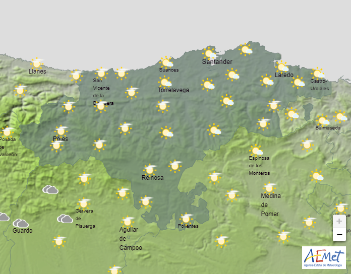 Temperaturas mínimas y máximas previstas: Cabezón de la Sal, 14 y 20 grados; Castro Urdiales, 12 y 19; Potes, 9 y 17; Reinosa, 3 y 13; San Vicente de la Barquera, 11 y 20; Santander, 14 y 20, y Torrelavega, 14 y 22 grados.