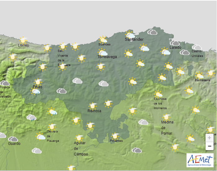 Temperaturas mínimas y máximas previstas: Cabezón de la Sal, 6 y 14 grados; Castro Urdiales, 8 y 14 ; Potes, 3 y 14; Reinosa, -1 y 10; San Vicente de la Barquera, 7 y 13; Santander, 7 y 14, y Torrelavega, 6 y 15 grados.