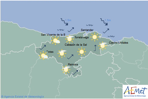 Temperaturas máximas y mínimas previstas: Cabezón de la Sal, 25 y 13 grados; San Vicente de la Barquera, 25 y 14; Santander, 26 y 15; Castro Urdiales, 26 y 14; Potes, 28 y 13; Reinosa, 25 y 9; y Torrelavega, 27 y 13 grados.