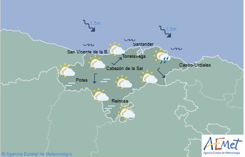 Temperaturas máximas y mínimas previstas: Cabezón de la Sal, 21 y 12 grados; San Vicente de la Barquera, 21 y 12; Santander, 22 y 12; Castro Urdiales, 21 y 11; Potes, 21 y 8; Reinosa, 17 y 3; y Torrelavega, 22 y 13 grados.