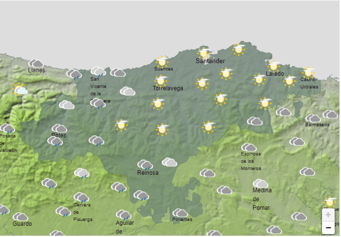 Temperaturas mínimas y máximas previstas: Cabezón de la Sal, 13 y 21 grados; Castro Urdiales, 12 y 22; Potes, 8 y 21; Reinosa, 8 y 16; San Vicente de la Barquera, 14 y 20; Santander, 13 y 22, y Torrelavega, 15 y 23 grados.