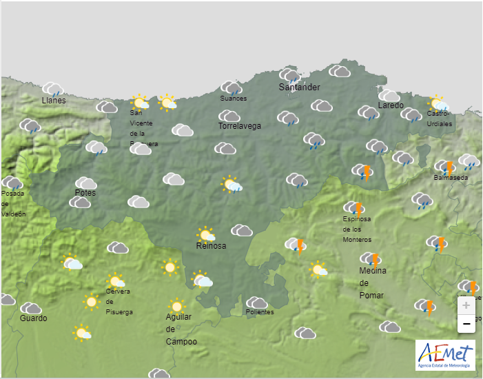 Temperaturas mínimas y máximas previstas: Cabezón de la Sal, 13 y 18 grados; Castro Urdiales, 14 y 19; Potes, 11 y 20; Reinosa, 7 y 16; San Vicente de la Barquera, 15 y 19; Santander, 16 y 19, y Torrelavega, 14 y 18 grados.
