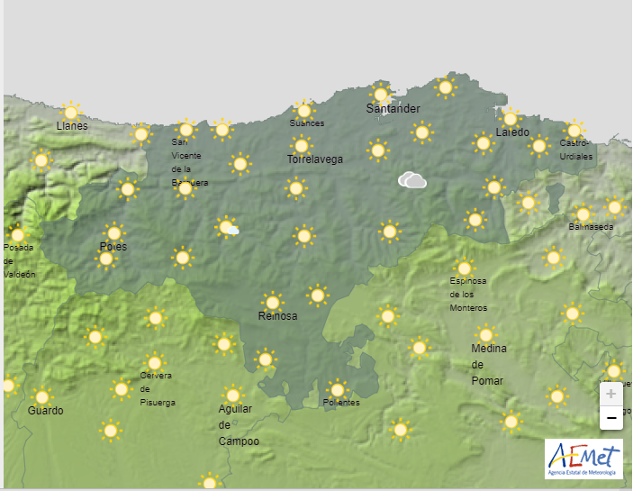 La Agencia Estatal de Meteorología (AEMET) prevé en Cantabria para este jueves, día 20, cielo poco nuboso salvo en la Cantabria del Ebro y extremo sureste de madrugada con cielos nubosos de nubes bajas y con probables brumas y bancos de niebla que tenderán a disiparse por la mañana. Por la tarde predominio de nubosidad alta.