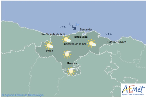 Temperaturas máximas y mínimas previstas: Cabezón de la Sal, 23 y 14 grados; San Vicente de la Barquera, 22 y 14; Santander, 22 y 14; Castro Urdiales, 22 y 15; Potes, 25 y 12; Reinosa, 23 y 7; y Torrelavega, 23 y 14 grados.
