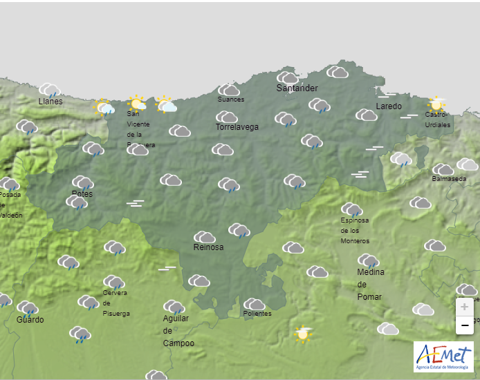 Temperaturas mínimas y máximas previstas: Cabezón de la Sal, 10 y 16 grados; Castro Urdiales, 12 y 16; Potes, 9 y 18; Reinosa, 5 y 15; San Vicente de la Barquera, 11 y 14; Santander, 12 y 16, y Torrelavega, 10 y 15 grados.