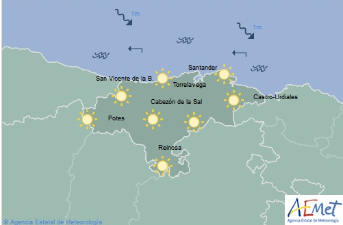 Temperaturas máximas y mínimas previstas: Cabezón de la Sal, 17 y 6 grados; San Vicente de la Barquera, 15 y 5; Santander, 14 y 3; Castro Urdiales, 15 y 7; Potes, 20 y 0; Reinosa, 18 y 1; y Torrelavega, 16 y 5 grados.