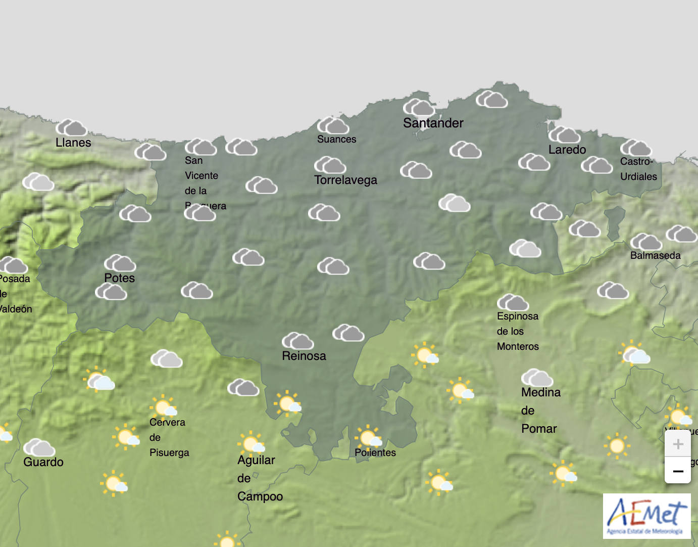 Temperaturas mínimas y máximas previstas: Cabezón de la Sal, 8 y 14 grados; Castro Urdiales, 7 y 14; Potes, 7 y 16; Reinosa, 0 y 11; San Vicente de la Barquera, 9 y 14; Santander, 7 y 14, y Torrelavega, 10 y 15 grados.