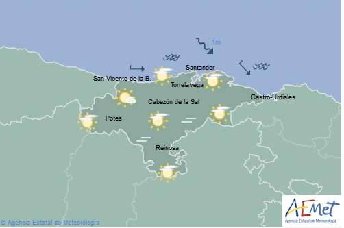 Temperaturas máximas y mínimas previstas: Cabezón de la Sal, 20 y 13 grados; San Vicente de la Barquera, 20 y 14; Santander, 21 y 13; Castro Urdiales, 21 y 13; Potes, 21 y 8; Reinosa, 18 y 5; y Torrelavega, 21 y 12 grados.