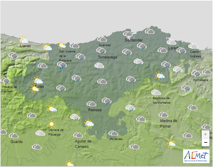 Temperaturas mínimas y máximas previstas: Cabezón de la Sal, 12 y 20 grados; Castro Urdiales, 9 y 21; Potes, 9 y 20; Reinosa, 7 y 17; San Vicente de la Barquera, 13 y 21; Santander, 13 y 21, y Torrelavega, 12 y 21 grados.