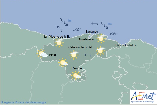 Temperaturas máximas y mínimas previstas: Cabezón de la Sal, 24 y 12 grados; San Vicente de la Barquera, 24 y 14; Santander, 25 y 15; Castro Urdiales, 23 y 15; Potes, 25 y 12; Reinosa, 23 y 9; y Torrelavega, 25 y 14 grados.
