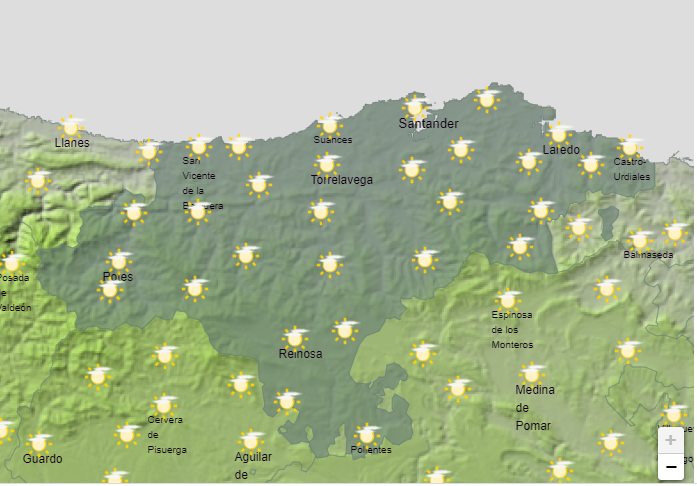 Temperaturas mínimas y máximas previstas: Cabezón de la Sal, 11 y 21 grados; Castro Urdiales, 11 y 19; Potes, 12 y 29; Reinosa, 8 y 27; San Vicente de la Barquera, 11 y 19; Santander, 13 y 19, y Torrelavega, 12 y 21 grados.