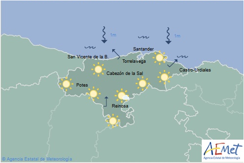 Temperaturas máximas y mínimas previstas: Cabezón de la Sal, 26 y 13 grados; San Vicente de la Barquera, 25 y 13; Santander, 25 y 15; Castro Urdiales, 24 y 15; Potes, 28 y 9; Reinosa, 25 y 8; y Torrelavega, 27 y 13 grados.
