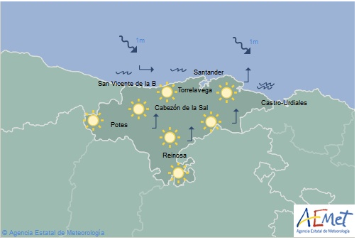 Temperaturas máximas y mínimas previstas: Cabezón de la Sal, 24 y 17 grados; San Vicente de la Barquera, 24 y 17; Santander, 24 y 18; Castro Urdiales, 25 y 18; Potes, 31 y 16; Reinosa, 30 y 12; y Torrelavega, 25 y 18 grados.
