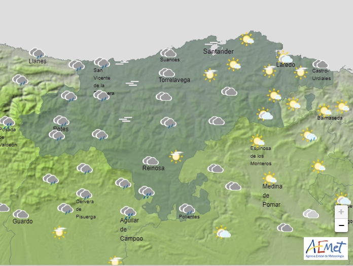 Temperaturas mínimas y máximas previstas: Cabezón de la Sal, 14 y 18 grados; Castro Urdiales, 14 y 17; Potes, 11 y 20; Reinosa, 6 y 17; San Vicente de la Barquera, 14 y 17; Santander, 14 y 18, y Torrelavega, 14 y 20 grados.