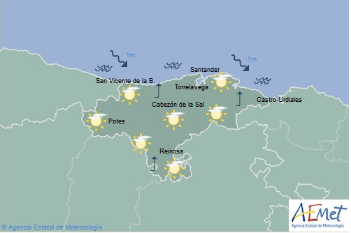 Temperaturas máximas y mínimas previstas: Cabezón de la Sal, 14 y 3 grados; San Vicente de la Barquera, 13 y 3; Santander, 14 y 2; Castro Urdiales, 14 y 6; Potes, 15 y -1; Reinosa, 14 y -1; y Torrelavega, 15 y 4 grados.