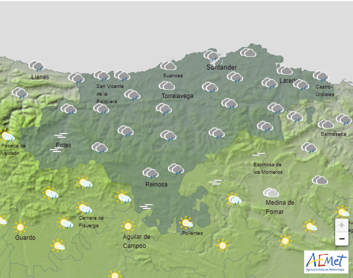 Temperaturas mínimas y máximas previstas: Cabezón de la Sal, 18 y 23 grados; Castro Urdiales, 18 y 23; Potes, 14 y 25; Reinosa, 11 y 21; San Vicente de la Barquera, 19 y 23; Santander, 20 y 24, y Torrelavega, 19 y 24 grados.