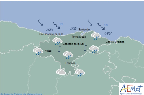 Temperaturas máximas y mínimas previstas: Cabezón de la Sal, 20 y 16 grados; San Vicente de la Barquera, 22 y 17; Santander, 22 y 19; Castro Urdiales, 22 y 18; Potes, 20 y 13; Reinosa, 17 y 7; y Torrelavega, 21 y 18 grados.