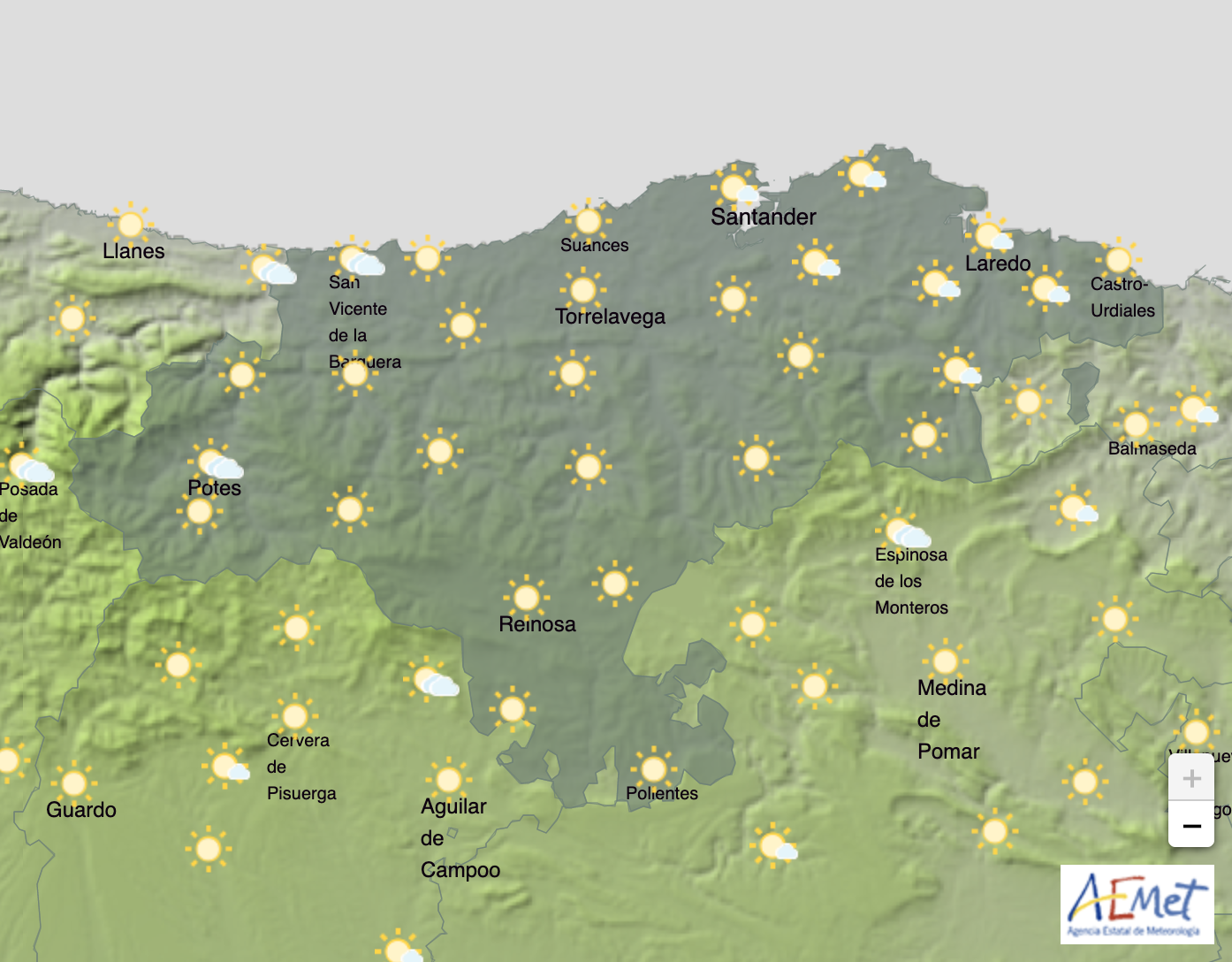 Temperaturas mínimas y máximas previstas: Cabezón de la Sal, 10 y 20 grados; Castro Urdiales, 8 y 18; Potes, 6 y 20; Reinosa, 6 y 16; San Vicente de la Barquera, 9 y 19; Santander, 9 y 19, y Torrelavega, 10 y 21 grados.