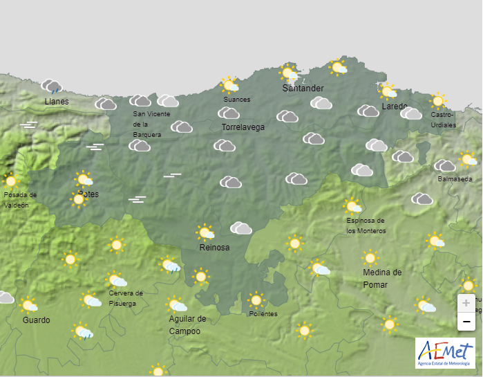 La Agencia Estatal de Meteorología (AEMET) prevé en Cantabria para este viernes, día 10, cielo nuboso con nubes bajas; brumas y bancos de niebla en zonas altas del sur y suroeste de madrugada, y lluvias débiles, poco probables en el extremo sur y algo más frecuentes e intensas en el noroeste.