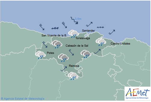 Temperaturas máximas y mínimas previstas: Cabezón de la Sal, 12 y 7 grados; San Vicente de la Barquera, 14 y 8; Santander, 14 y 9; Castro Urdiales, 13 y 8; Potes, 9 y 4; Reinosa, 4 y 1; y Torrelavega, 12 y 8 grados.