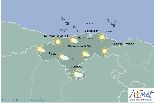 Temperaturas máximas y mínimas previstas: Cabezón de la Sal, 13 y 3 grados; San Vicente de la Barquera, 13 y 4; Santander, 13 y 6; Castro Urdiales, 13 y 6; Potes, 12 y -4; Reinosa, 8 y -4; y Torrelavega, 13 y 5 grados.