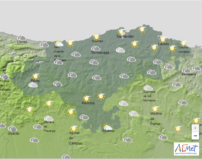 Temperaturas mínimas y máximas previstas: Cabezón de la Sal, 11 y 16 grados; Castro Urdiales, 12 y 15; Potes, 9 y 17; Reinosa, 6 y 15; San Vicente de la Barquera, 11 y 16; Santander, 13 y 17, y Torrelavega, 11 y 17 grados.