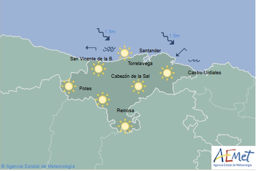 Temperaturas máximas y mínimas previstas: Cabezón de la Sal, 23 y 13 grados; San Vicente de la Barquera, 22 y 13; Santander, 23 y 12; Castro Urdiales, 22 y 14; Potes, 27 y 10; Reinosa, 24 y 6; y Torrelavega, 24 y 12 grados.