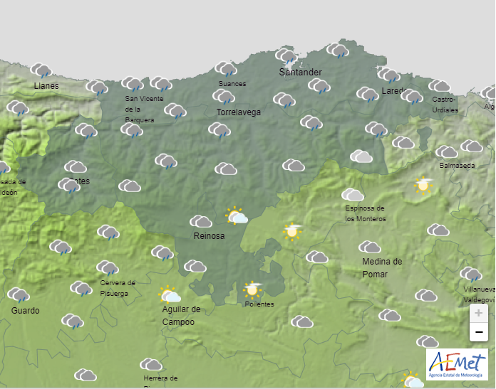 Temperaturas mínimas y máximas previstas: Cabezón de la Sal, 12 y 21 grados; Castro Urdiales, 13 y 21; Potes, 10 y 20; Reinosa, 7 y 15; San Vicente de la Barquera, 12 y 21; Santander, 14 y 21, y Torrelavega, 14 y 21 grados.