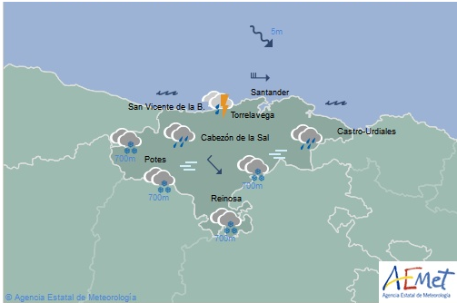 La Agencia Estatal de Meteorología (AEMET) prevé en Cantabria para este viernes día 15, cielo nuboso o cubierto, con brumas y bancos de niebla en zonas altas y precipitaciones generalizadas, localmente fuertes y persistentes en el litoral, donde pueden ir acompañadas de tormentas y granizo, y que serán menos frecuentes e intensas cuanto más al sur y por la tarde.