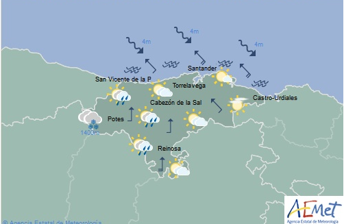 Temperaturas máximas y mínimas previstas: Cabezón de la Sal, 12 y 8 grados; San Vicente de la Barquera, 12 y 8; Santander, 16 y 9; Castro Urdiales, 17 y 8; Potes, 13 y 6; Reinosa, 9 y 4; y Torrelavega, 16 y 8 grados.