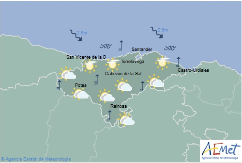 Temperaturas máximas y mínimas previstas: Cabezón de la Sal, 17 y 14 grados; San Vicente de la Barquera, 18 y 15; Santander, 18 y 14; Castro Urdiales, 17 y 15; Potes, 13 y 13; Reinosa, 11 y 7; y Torrelavega, 18 y 14 grados.