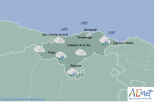 La Agencia Estatal de Meteorología (AEMET) prevé en Cantabria para este lunes día 16, cielo muy nuboso tendiendo hasta poco nuboso al final. Lluvias y chubascos generalizados de madrugada y por la tarde en el interior, ocasionalmente con tormenta y sin descartar que sean localmente fuertes en las zonas de Liébana y Cantabria del Ebro.