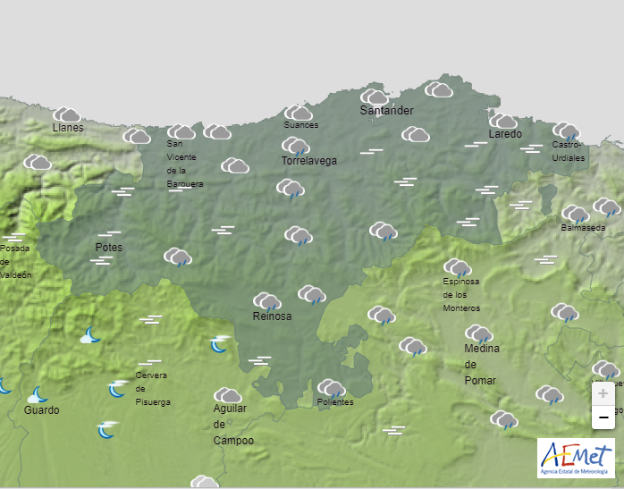 La Agencia Estatal de Meteorología (AEMET) prevé en Cantabria para este martes, día 17, cielo nuboso o cubierto con brumas y bancos de niebla en zonas altas y con lluvias débiles y chubascos dispersos, ocasionalmente con tormentas, tendiendo a intervalos nubosos y a desaparecer las precipitaciones por la tarde.