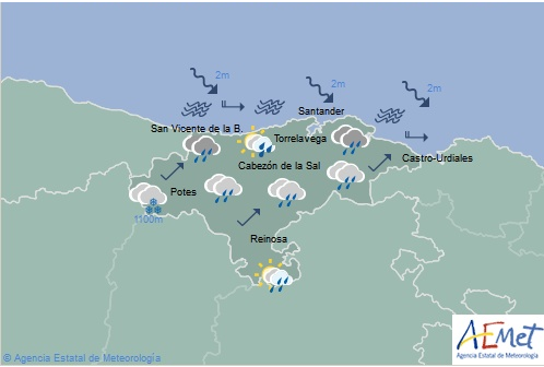 La Agencia Estatal de Meteorología (AEMET) prevé en Cantabria para este domingo, día 17, cielos nubosos o cubiertos, con lluvias y chubascos generalizados, localmente fuertes y persistentes en el litoral, sin descartar alguna tormenta, y menos frecuentes e intensas cuanto más al sur. Cota de nieve en torno a 1.200 metros, bajando hasta 1.000 al principio y final del día.