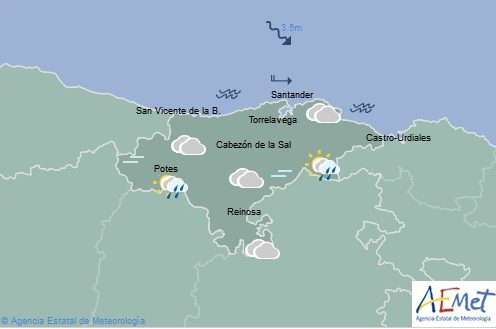 Temperaturas máximas y mínimas previstas: Cabezón de la Sal, 19 y 14 grados; San Vicente de la Barquera, 21 y 16; Santander, 20 y 16; Castro Urdiales, 19 y 15; Potes, 20 y 10; Reinosa, 16 y 7; y Torrelavega, 20 y 14 grados.