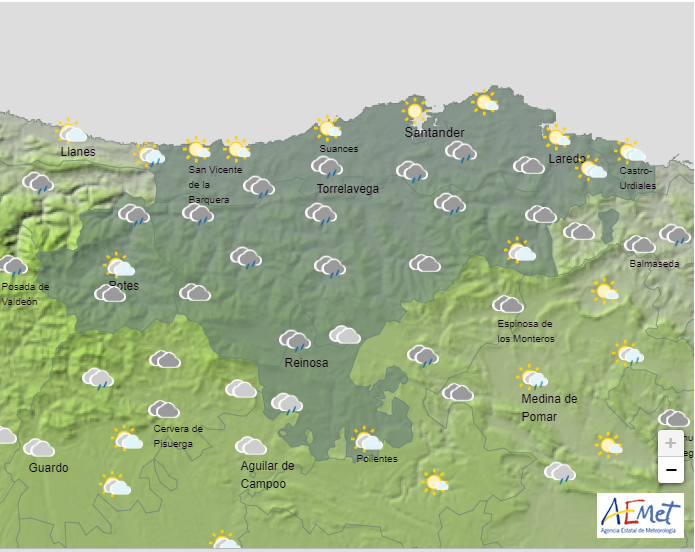 Temperaturas mínimas y máximas previstas: Cabezón de la Sal, 13 y 18 grados; Castro Urdiales, 15 y 18; Potes, 12 y 19; Reinosa, 5 y 15; San Vicente de la Barquera, 14 y 19; Santander, 14 y 19, y Torrelavega, 13 y 20 grados.