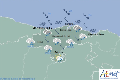 Temperaturas máximas y mínimas previstas: Cabezón de la Sal, 11 y 5 grados; San Vicente de la Barquera, 13 y 6; Santander, 13 y 7; Castro Urdiales, 12 y 7; Potes, 9 y 2; Reinosa, 7 y -1; y Torrelavega, 12 y 5 grados.