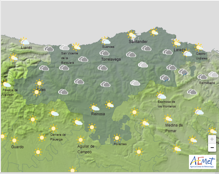 La Agencia Estatal de Meteorología (AEMET) prevé en Cantabria para este viernes, día 19, intervalos de nubes bajas por la mañana salvo en el extremo sur con cielos poco nubosos, aumentando la nubosidad a partir de mediodía con intervalos de nubes de evolución y abriéndose claros nuevamente al final.