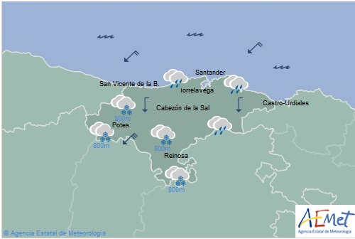 Temperaturas máximas y mínimas previstas: Cabezón de la Sal, 10 y 5 grados; San Vicente de la Barquera, 12 y 6; Santander, 12 y 8; Castro Urdiales, 11 y 7; Potes, 7 y 1; Reinosa, 4 y -4; y Torrelavega, 11 y 7 grados.