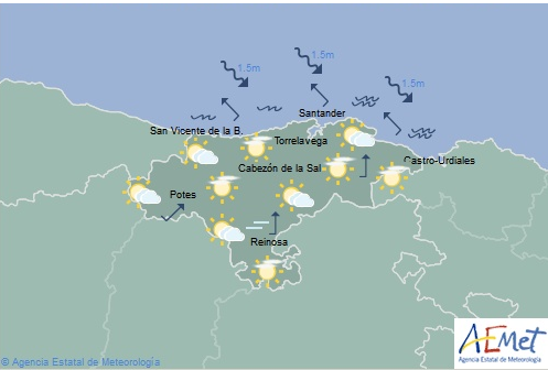 Temperaturas máximas y mínimas previstas: Cabezón de la Sal, 14 y 3 grados; San Vicente de la Barquera, 14 y 5; Santander, 15 y 6; Castro Urdiales, 14 y 7; Potes, 12 y 0; Reinosa, 8 y -1; y Torrelavega, 15 y 4 grados.