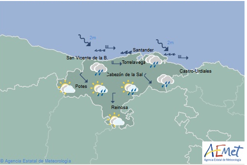 Temperaturas máximas y mínimas previstas: Cabezón de la Sal, 19 y 14 grados; San Vicente de la Barquera, 20 y 16; Santander, 20 y 16; Castro Urdiales, 19 y 15; Potes, 20 y 11; Reinosa, 15 y 8; y Torrelavega, 19 y 15 grados.