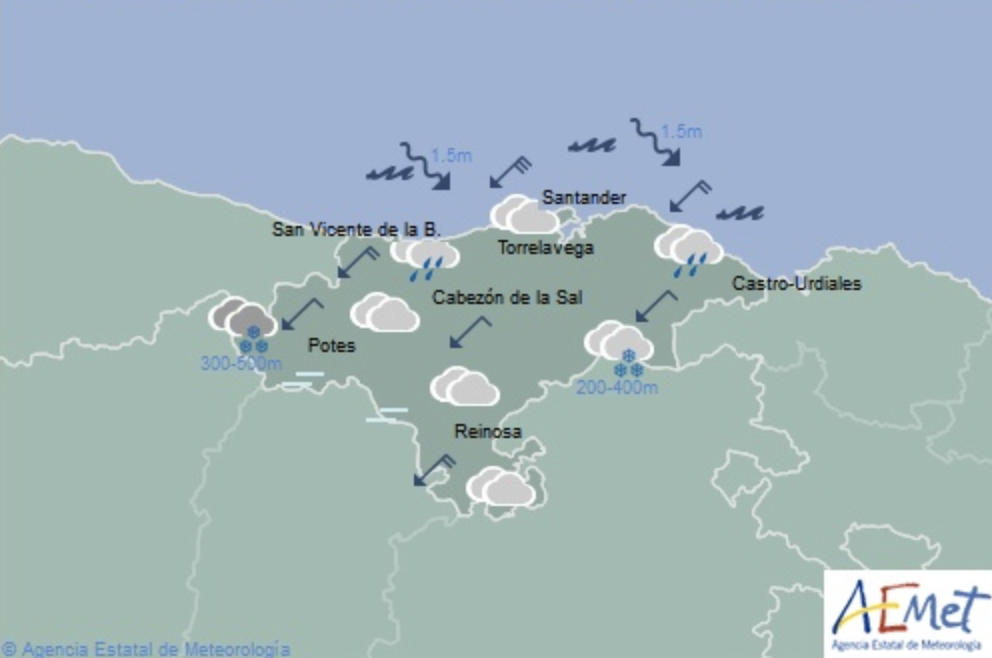 Temperaturas máximas y mínimas previstas: Cabezón de la Sal, 8 y 3 grados; San Vicente de la Barquera, 11 y 4; Santander, 11 y 7; Castro Urdiales, 10 y 6; Potes, 4 y -2; Reinosa, 1 y -5; y Torrelavega, 9 y 5 grados.