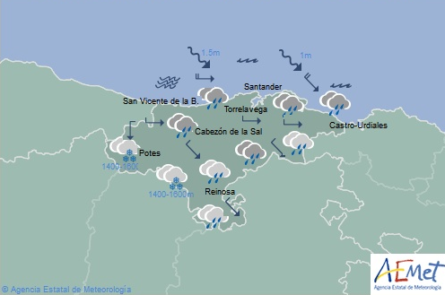 Las precipitaciones pueden ser en forma de nieve en el extremo suroeste por encima de 1400-1600 metros. Temperaturas en descenso ligero, con mínimas que se esperan al final del día. Heladas débiles y dispersas en zonas altas de Liébana.